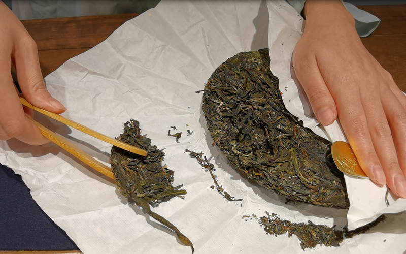 將成塊的茶餅取下,放入茶葉罐或茶則中,拆茶餅是將茶餅按照生產規律拆成松散狀態,分層拆下,盡量避免蠻力將茶撬成碎末。